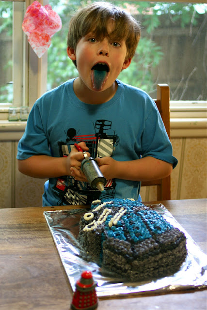Ethan's 10th Birthday. He's finishing off the decoration of his birthday cake. Donald cut the Dalek shape and piped the outlines and Ethan filled in the Dalek with blue icing, hence the blue tongue.
